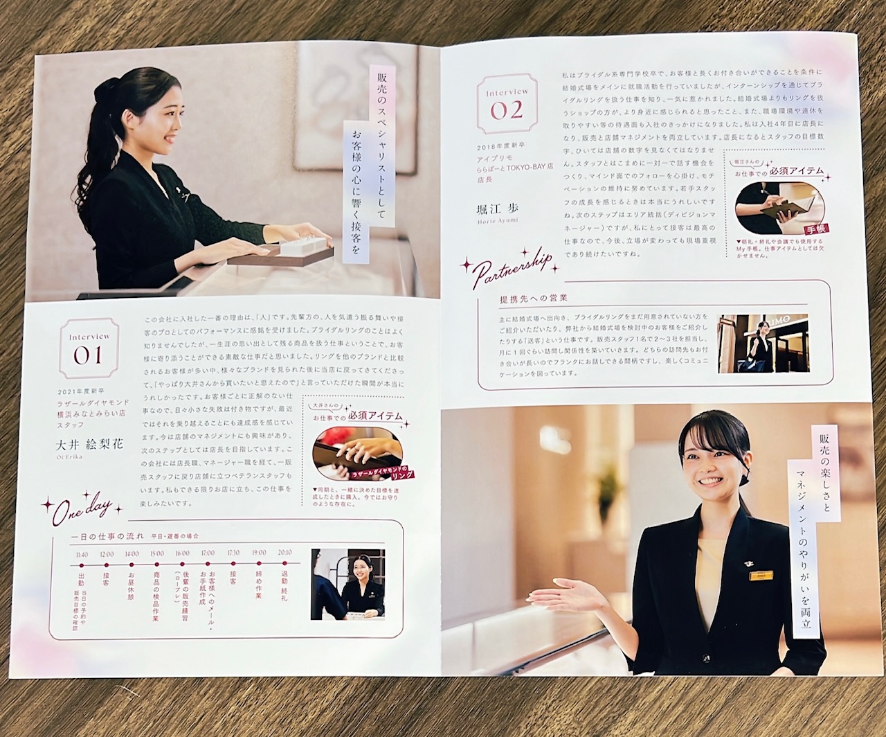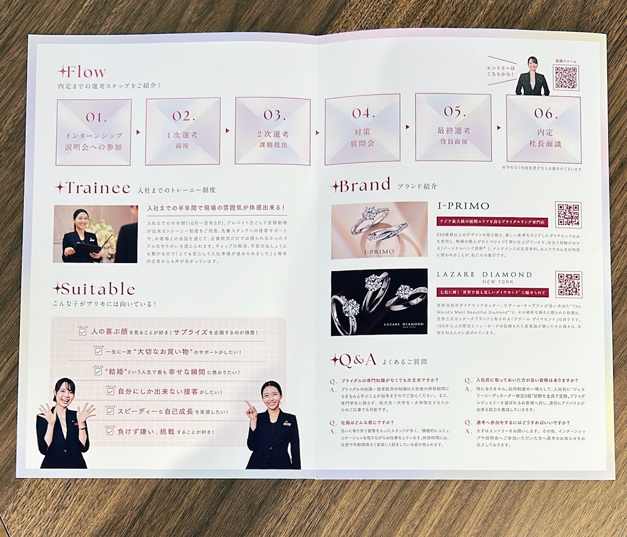 ブライダルジュエリーの企画・販売事業を国内外に展開するプリモグローバルホールディングス株式会社の中核会社様の新卒採用パンフレット制作を担当させていただきました。