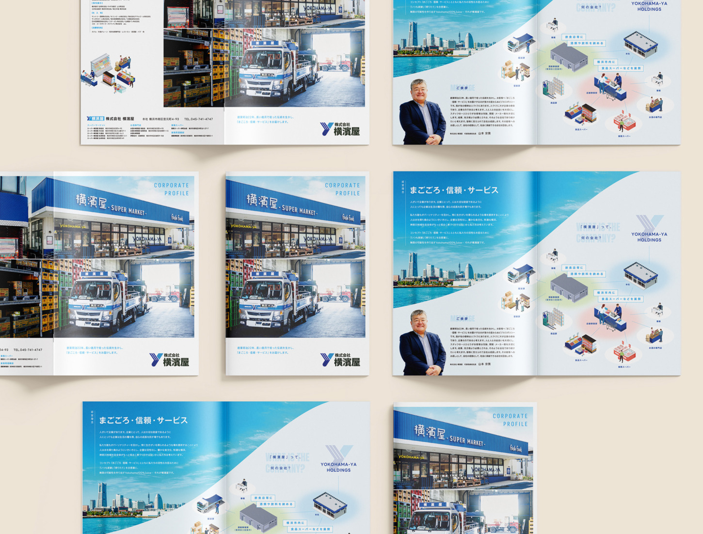 横浜を拠点に、食品スーパーや酒類卸事業など幅広く展開されている株式会社横濱屋様。採用ツールおよび会社案内として活用するパンフレットの制作をご依頼いただきました。あわせて、会社説明会で使用するスライドも同時に制作しています。